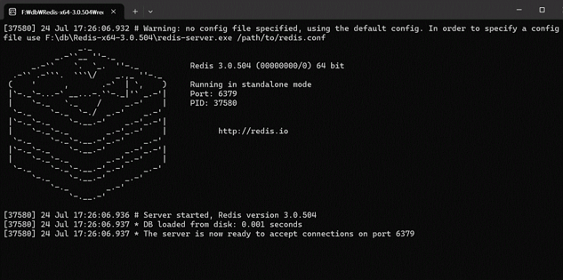 - Redis 서버 실행 : 압축을 해제한 폴더에서 redis-server.exe 파일을 실행합니다. 명령 프롬프트 창이 열리면서 Redis 서버가 시작됩니다.