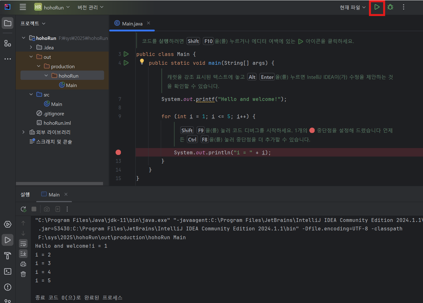 오른쪽 상단에 버튼을 클릭하면 아래 콘솔 창에 출력된 내용을 확인할 수 있습니다.