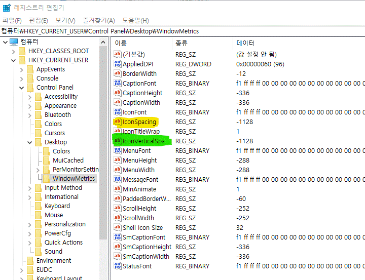레지스트리 편집기 바탕화면 아이콘 간격수정