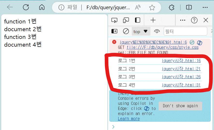 왼쪽 document.write 출력과 오른쪽 console.log가 실행된 화면입니다.